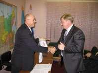 На фото: первое заседание Совета депутатов в 2005 г. Виктор Поляков вручает удостоверение депутату, директору предприятия "Голицыно-инструмент" Алексею Ермакову.
