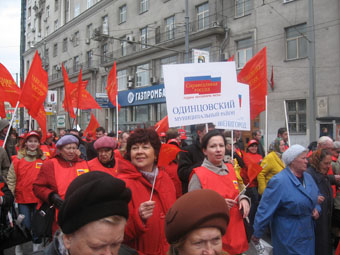 На фото: 1 мая 2007 г. Праздничная колонна жителей Одинцовского района на манифестации "Справедливой России" шагает по Тверской.