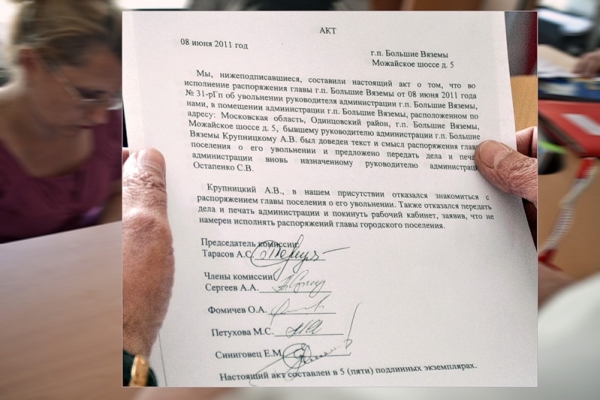 Сложная юридическая ситуация возникла после решения Одинцовского городского суда. Распоряжение Главы городского поселения Большие Вяземы Андрея Белогурова об увольнении Андрея Крупницкого признано незаконным. Таким образом, Крупницкий восстановлен в должности руководителя администрации с 8 июня 2011 года. Тем не менее, в Больших Вяземах уже назначен новый Глава администрации и приступил к работе.