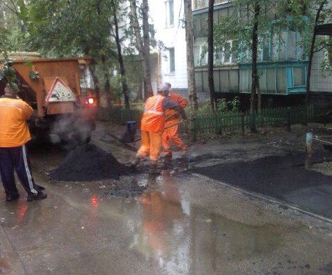 На фото: укладка асфальта во дворе на Советской идет прямо в лужи. Так развивается город