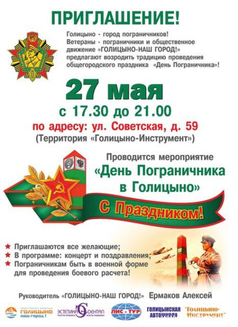 Руководитель движения "Голицыно - наш город" Алексей Ермаков приглашает жителей на празднование Дня пограничника. Праздник состоится 27 мая в 18.00 на территории предприятия "Голицыно-Инструмент" (Голицыно, ул.Советская, д.59).