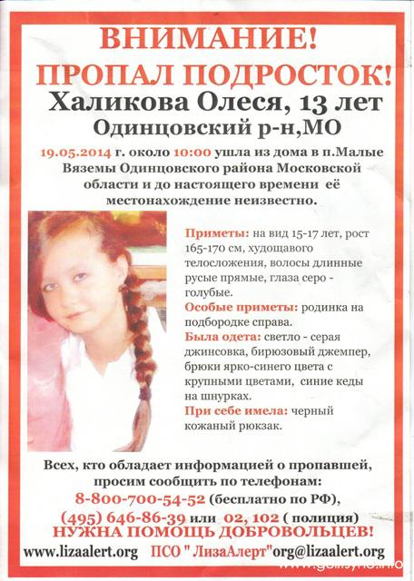 13-летняя девочка Олеся Халикова ушла 19 мая около 10.00 из дома в поселке Малые Вяземы и с тех пор о ней ничего не известно. Добровольцы из общественной организации "Лиза Алерт" расклеивают листовки в районе станции Голицыно.