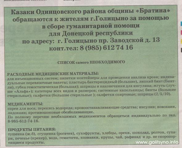 Официальный печатный орган администрации городского поселения "Вести Голицыно" разместил интересное обращение. Горожан призывают помочь гуманитарной помощью непризнанной республике. Акцию проводят казаки Одинцовского района. Согласно размещенной информации на страницах бюджетной газеты, дончанам требуются расходные медицинские материалы, медикаменты, а также продукты питания.