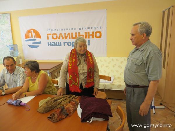 В качестве благодарности за отзывчивость и широту души, лидер голицынских коммунистов Сергей Свищ наградил активную пенсионерку красным шарфом с надписью "Советский союз".