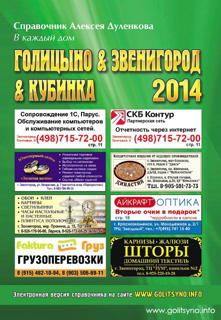 Каждый год компактная зеленая книжка адресов и телефонов приходится в квартиры жителей трех городов, а именно Голицыно, Звенигорода и Кубинки, а также поселков Большие Вяземы и Городок-17. В справочнике содержатся номера телефонов администраций, медицинских учреждений, управляющих компаний, школ, детских садов... - всего более 500 организаций.