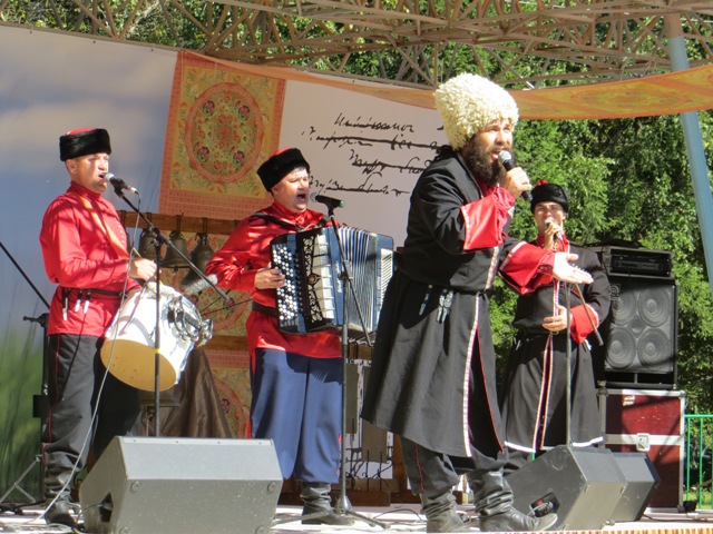 В то время, пока представитель власти изучала палатки, на соседней площадке звучала украинская песня: на сцену вошли партизаны. Брутальные мужики из фольклорной группы "Партизан FM" развлекали посетителей музей-заповедника, а взамен публика одарила их бурными аплодисментами.