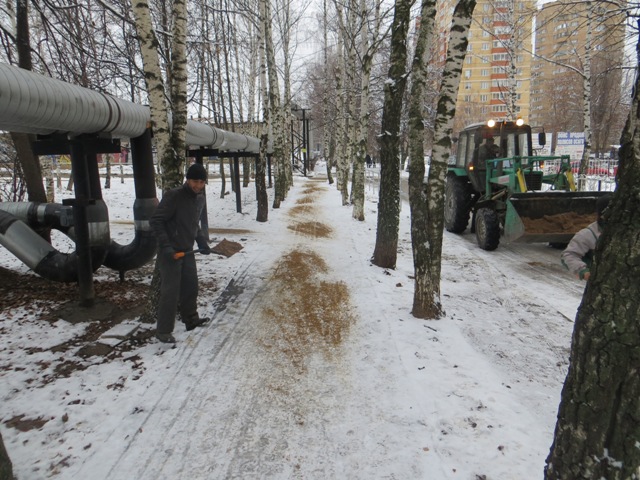 Во дворах заметны коммунальщики, энергичные ребята из солнечных республик. Посыпают песком дорожки и в целом, надо признать, они пригодны для пешеходов. Уборке Советской улицы можно поставить твердую "четверку".