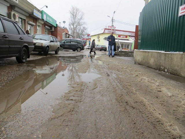 Хуже всего ситуация на Железнодорожном проспекте. Такое ощущение, что территория между магазинами не интересует никого и хозяина тут нет. Следов коммунальных служб не обнаружено. А при малейшей оттепели граждане вынуждены тренироваться в прыжках в длину через обширные лужи. Дорогам, прилегающим к станции Голицыно с южной стороны, можно ставить отметку "Неудовлетворительно".