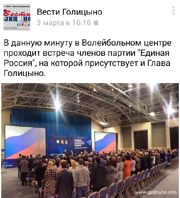 Судя по сообщению в одной из социальных сетей, вниманию голицынских женщин Глава города предпочел другое общество, состоящее преимущественно из мужчин. Видимо, днем господин Дудоров поучаствовал в особенно важном мероприятии - встрече членов одинцовской ячейки партии "Единая Россия" в Волейбольном центре города Одинцово.